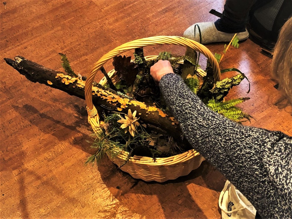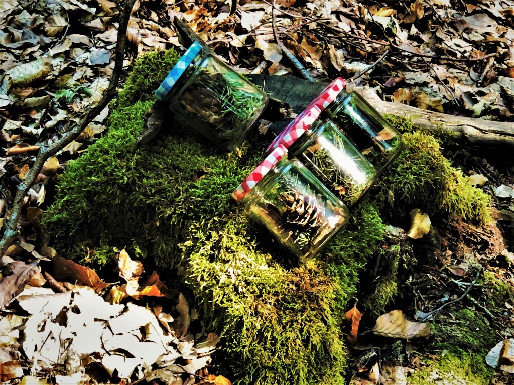 Dort sammelt man gemeinsam Material des Waldes (Zapfen, Borke, Nadeln…), die in das Glas gesteckt werden.