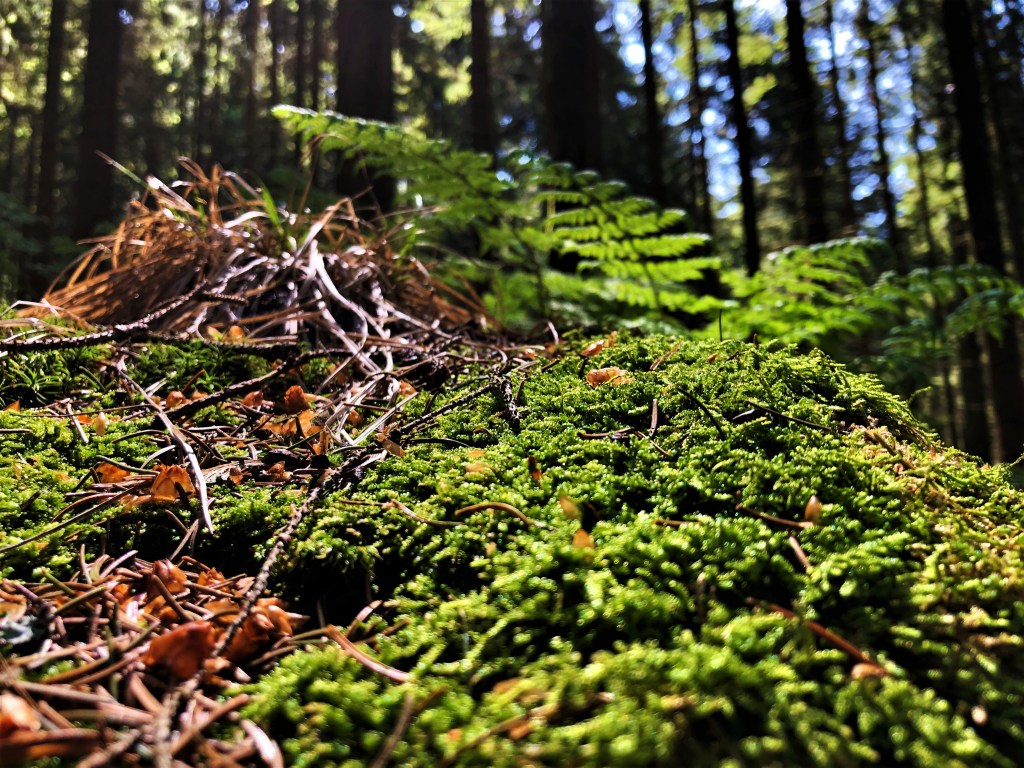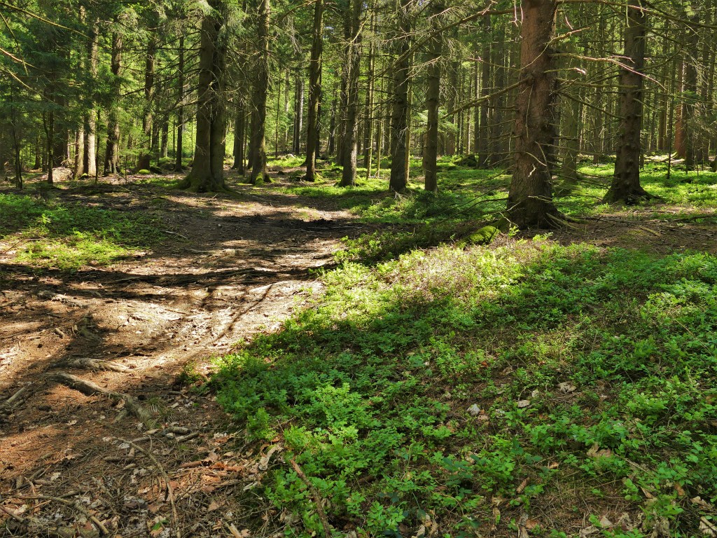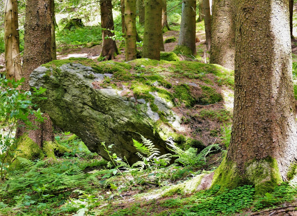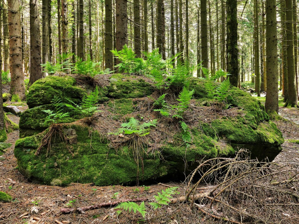 Der Boden ist bedeckt von Steinen und kleinen Felsen, die vom Bewuchs grün schimmern. Die Wege im Wald, die fast senkrecht nach oben gehen, sind sehr steinig und lassen vermuten, dass es auch unter dem weichen Waldboden steinig ist. Doch die Fichten lassen sich nicht entmutigen, hier überall zu wurzeln.