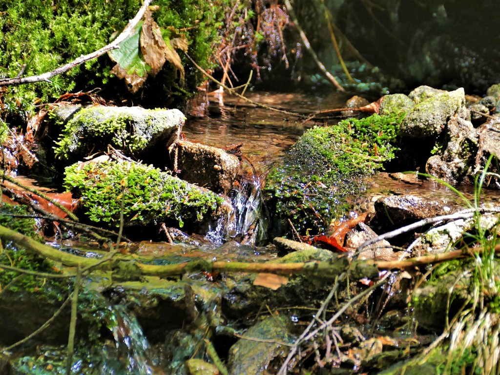 An Steinhaufen im Wald sammelt sich die Lebenskraft der Landschaft. Besonders dann, wenn diese mit Moosen überzogen sind und überall dazwischen immergrüne Bäume wachsen. Bäume und Felsen, sagt man in der Geomantie (siehe unter „Links“ am Ende des Artikels), sind Landschaftselemente, die eine hohe Vitalkraft beherbergen. Ist zudem genügend Wasser vorhanden, so wie hier in Rettenbach, sorgt dieses dafür, dass die Bäume gut versorgt sind und gesund wachsen können. Solche Orte wurden früher in vielen Kulturen aufgesucht, um die Natur zu verehren. Sie eignen sich hervorragend zum Meditieren und Entspannen. Als Dauerwohnsitz sind sie unterdessen nicht geeignet, was an vielen Kraftorten der Fall ist – dauerhaft zu viel Energie tut uns eben auch nicht gut.