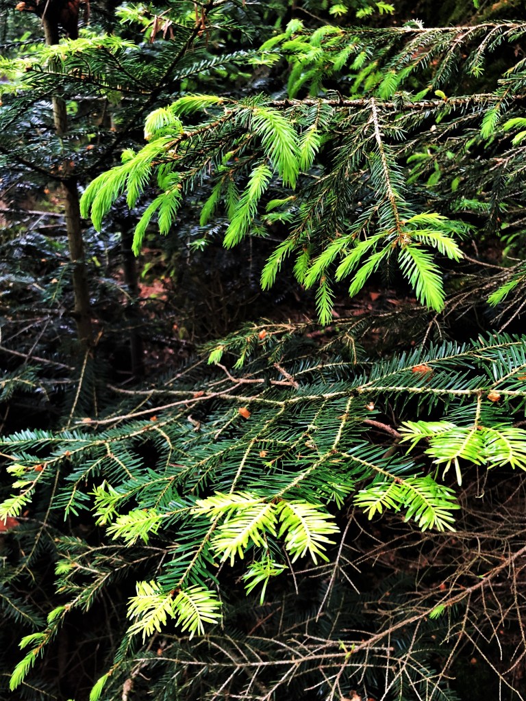Hier in 800 Meter Höhe und mit viel Wasser im Boden ist die Fichte quietschfidel. Ich kann mich kaum an einen solche gesunden und robusten Fichtenwald erinnern. Es ist kein Vergleich, bei uns in den Niederungen bei nicht mal 200 Höhenmetern durch einen Fichtenforst zu spazieren und dagegen hier in der angenehmen Frische zwischen diesen Bäumen zu schlendern.