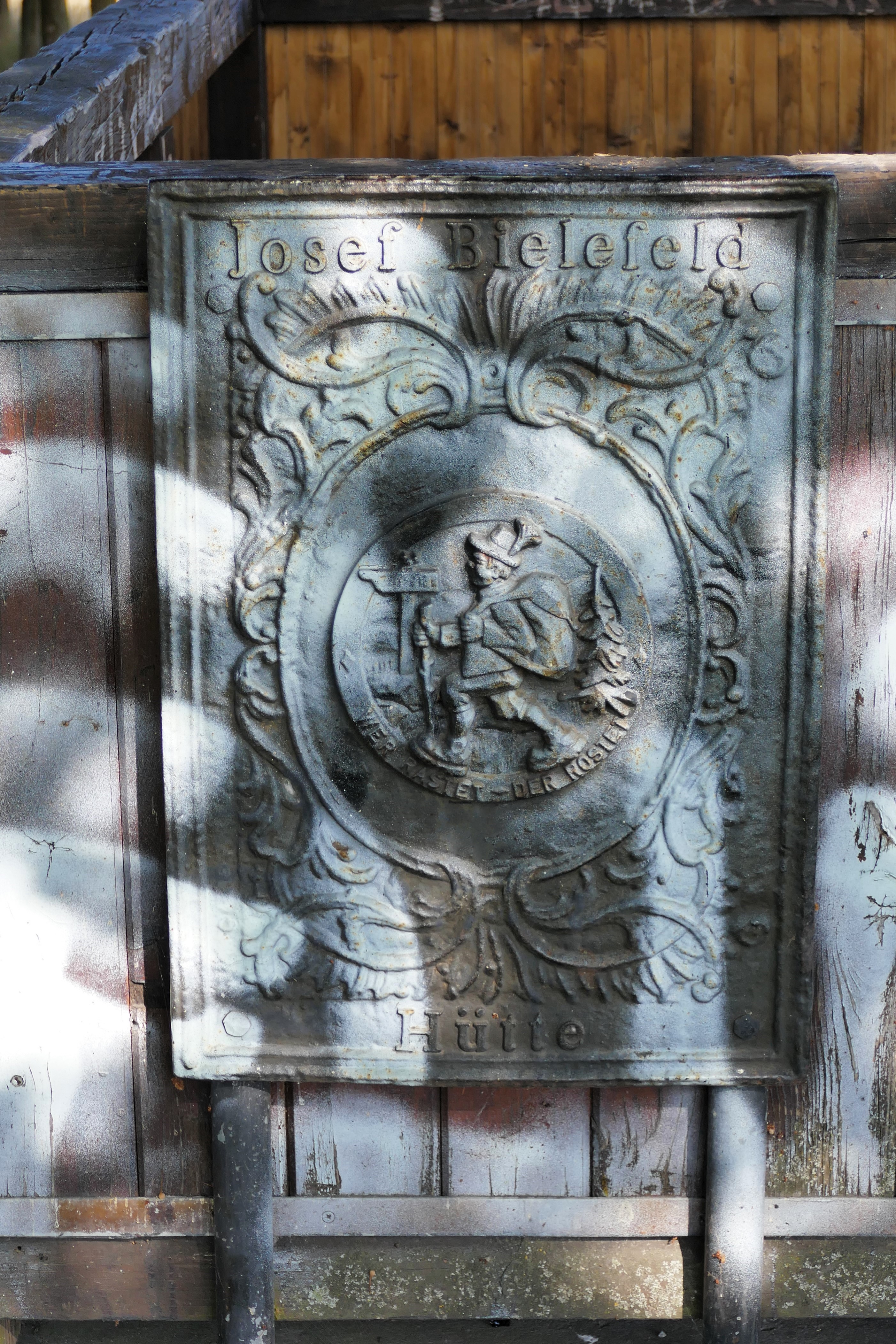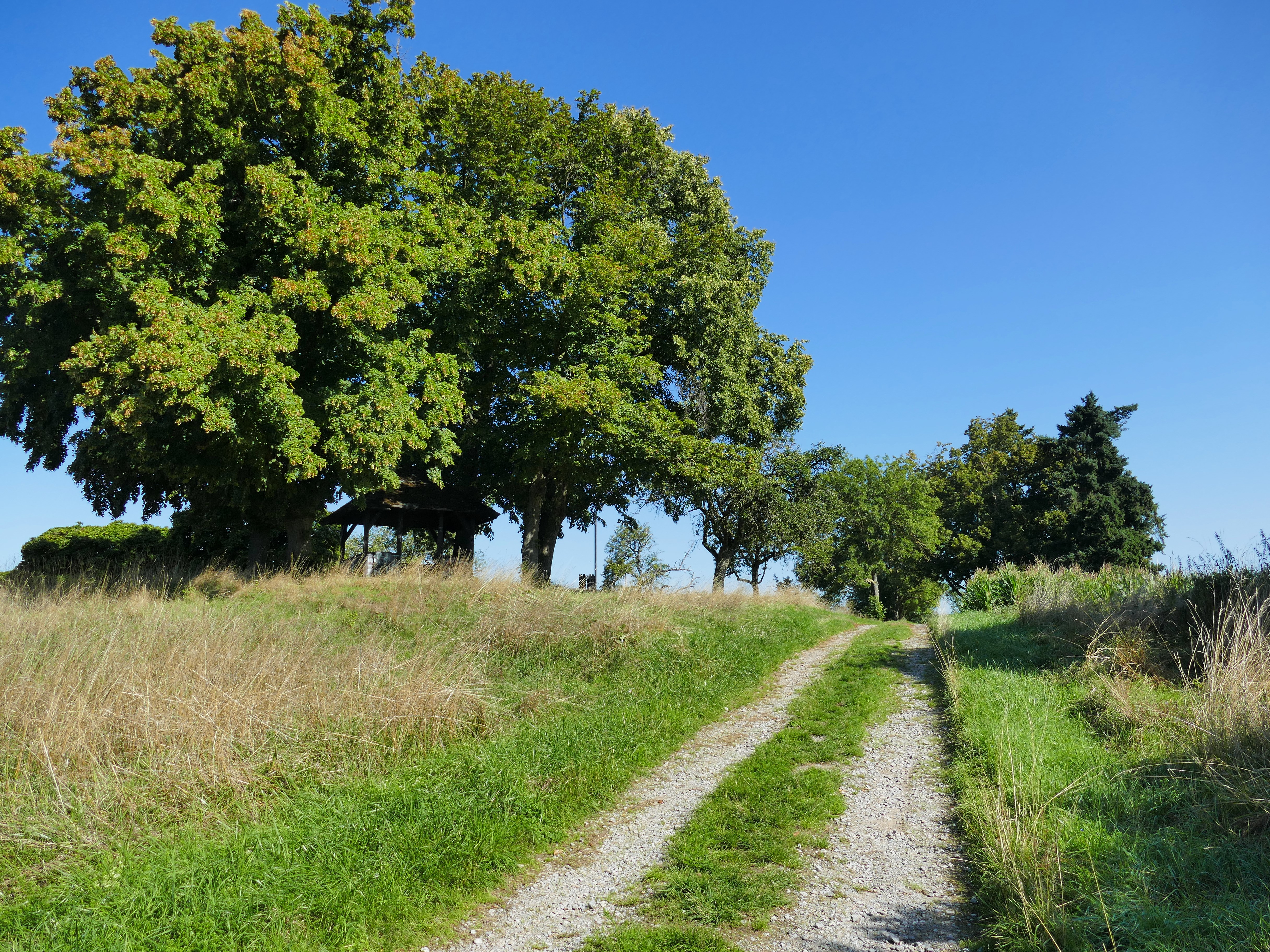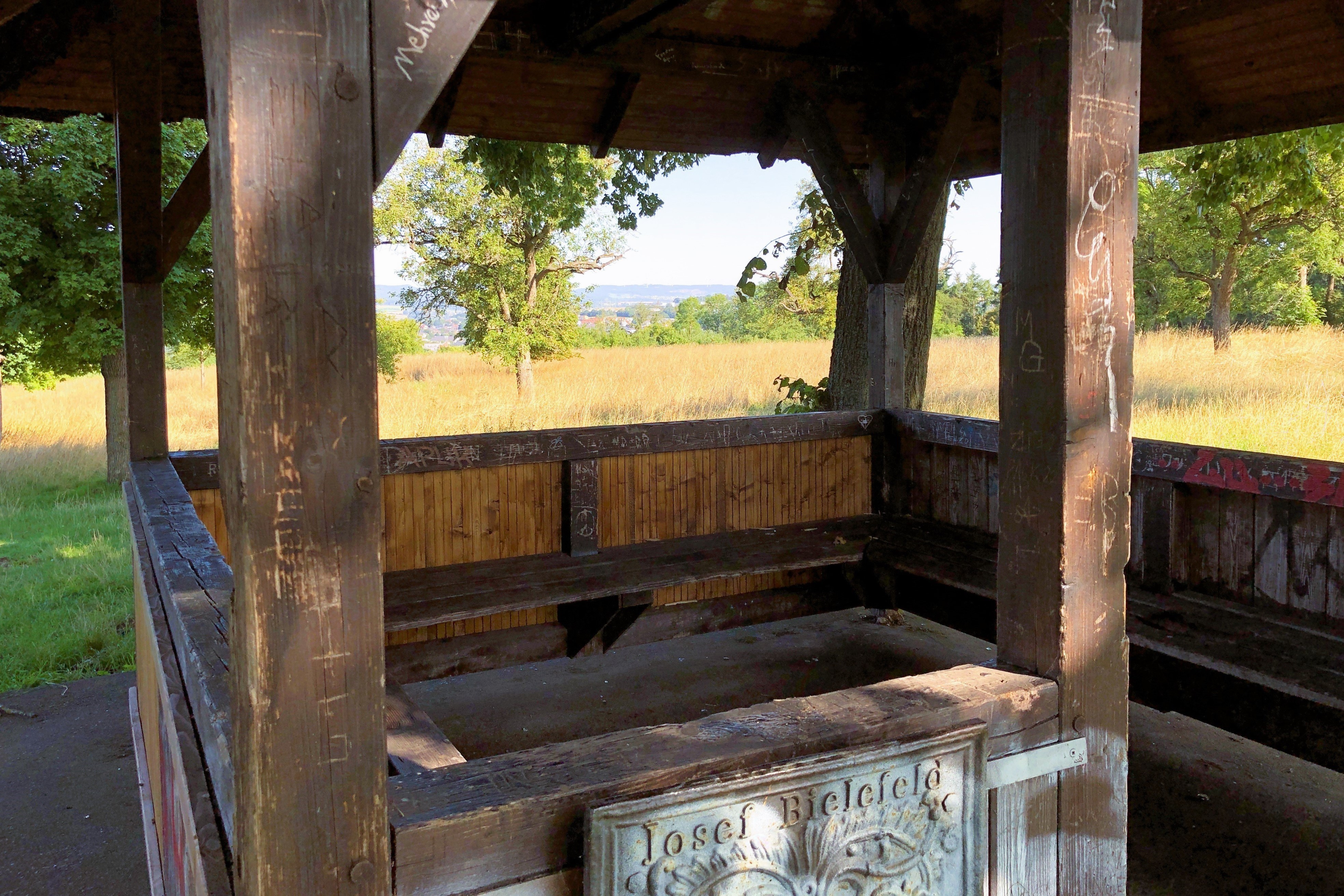 Durch eine Ahorn-Allee schreitend erreiche ich die Josef-Bielefeld-Hütte. Da hat die Hütte ja wirklich einen bemerkenswerten Auftritt. Ich denke, das ist auch in etwa der höchste Punkt der Kuppe. Die nahe Autobahn macht sich bemerkbar. Man sollte hier nicht nach rechts abbiegen (wie ich es zuerst gemacht habe), denn dann nähert man sich ihr noch mehr. Also direkt nach der Hütte den Weg nach links wählen.
