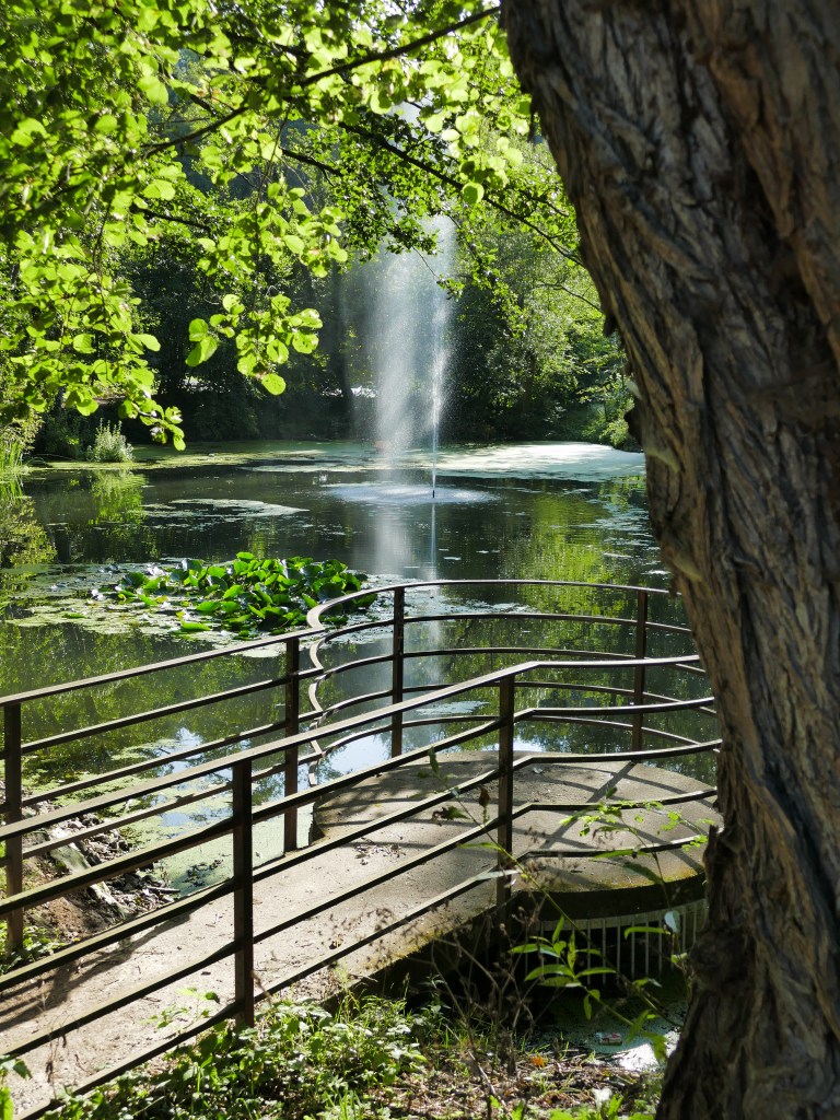 Mein Weg geht über die Straße „Im Schlenkert“ (Südseite des Bahnhofes ZOB Süd) zum „Busche Weiher“ im Tal Josaphat (das wohl nur bei der Bevölkerung so genannt wird, offiziell ist es das Kasselbachtal). Der Busche Weiher ist ein erstes schönes Plätzchen. Im Morgenlicht glitzert das Wasser und es ist sehr still hier. Auf dem nahegelegenen Spielplatz tummeln sich nur ein paar Vögel. Ich passiere den Busche Weiher am rechten Ufer und muss mich sogleich entscheiden: entweder den Waldlehrpfad links hoch zu nehmen oder den Kreuzweg geradeaus.