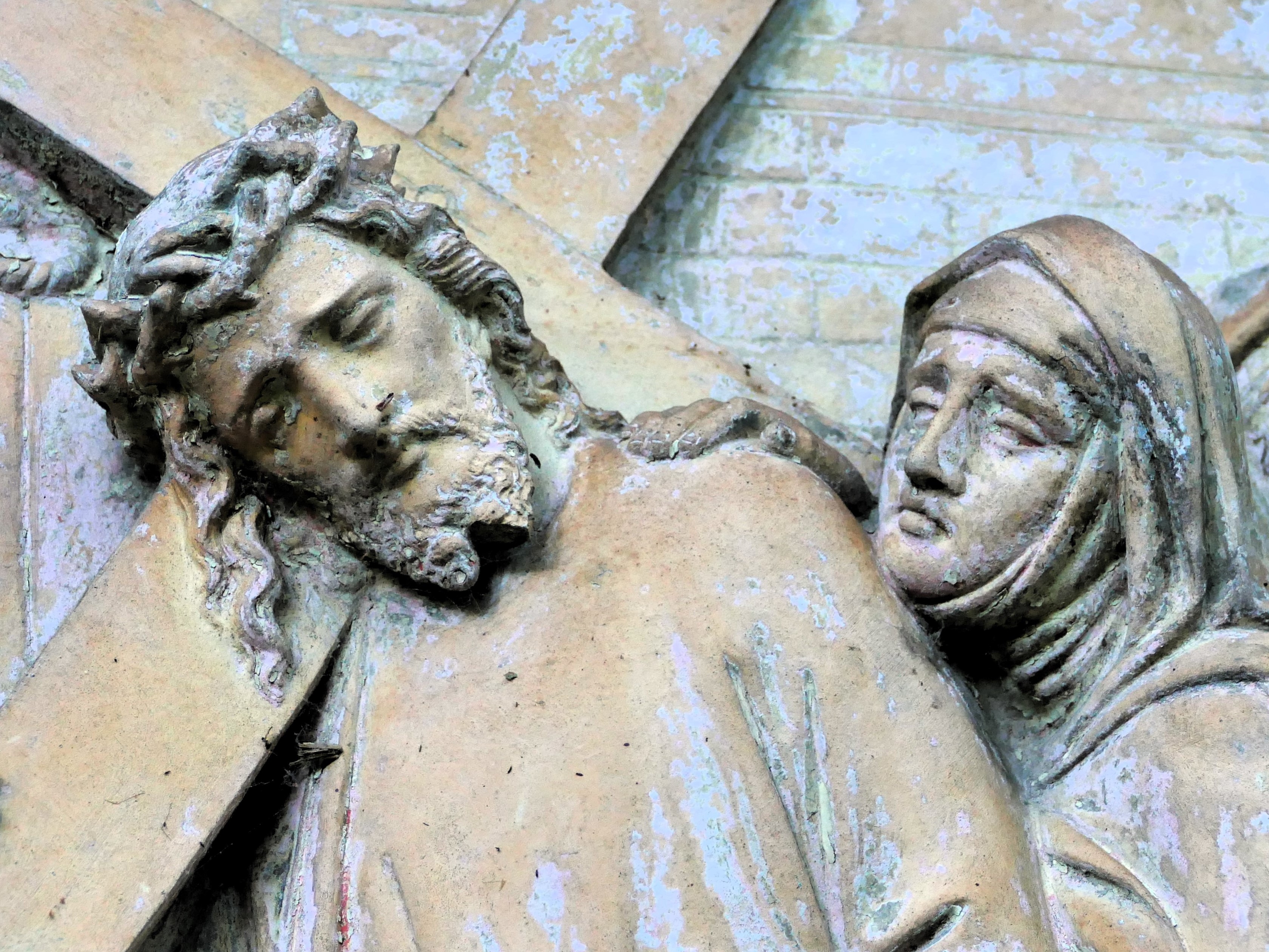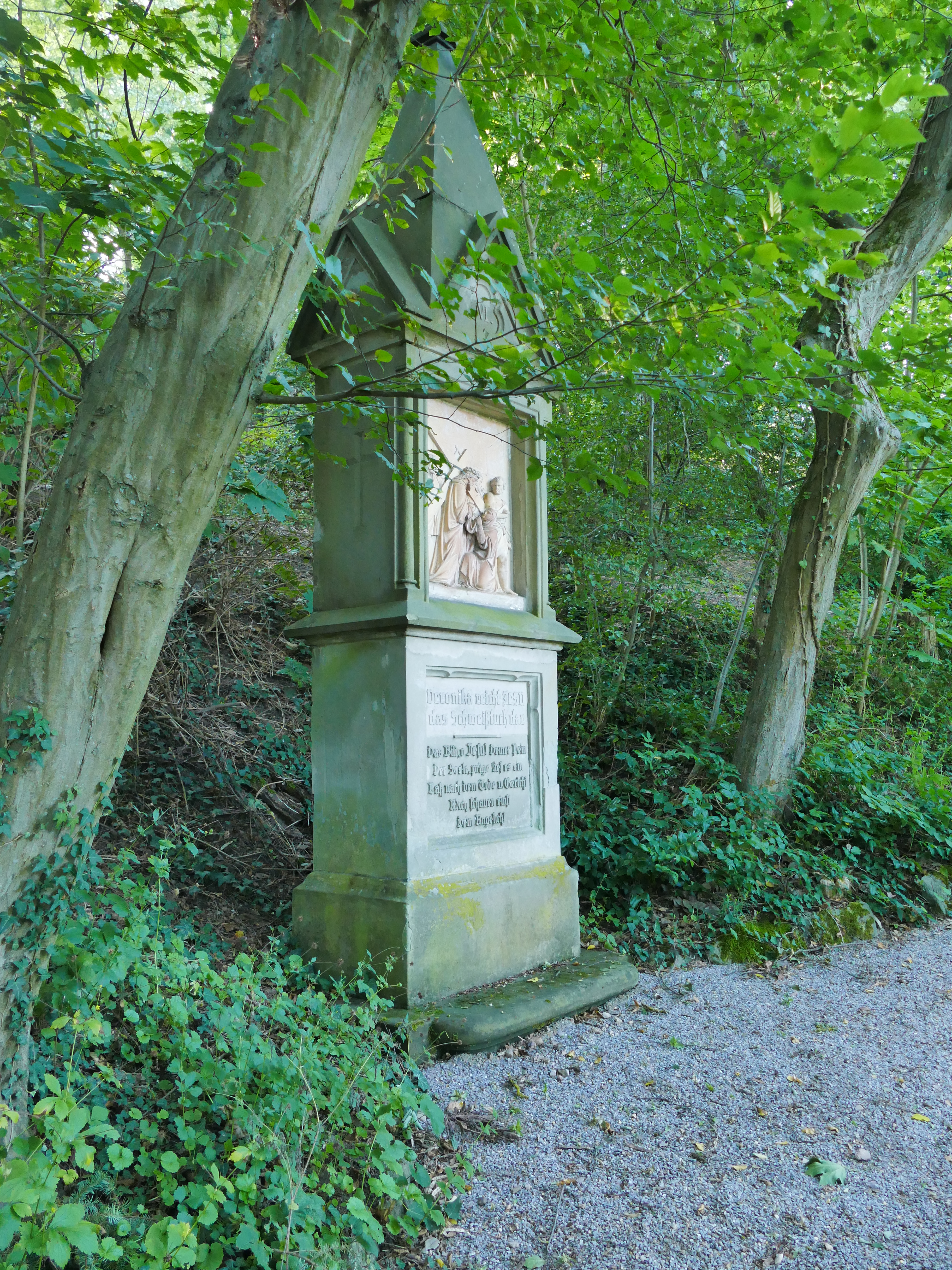 Ich entscheide mich für den Kreuzweg, da ich auch die Kreuzkapelle an seinem Ende ansehen will. Es ist eine gute Entscheidung. Der gepflegte Weg führt mich in sanften Serpentinen vorbei an den neogotische Sandsteinstelen mit ihren Pyramidendächern in die Höhe. Die Bildstöcke sind fein gearbeitet und ich versinke ein bisschen ins Ansehen und Nachsinnen.