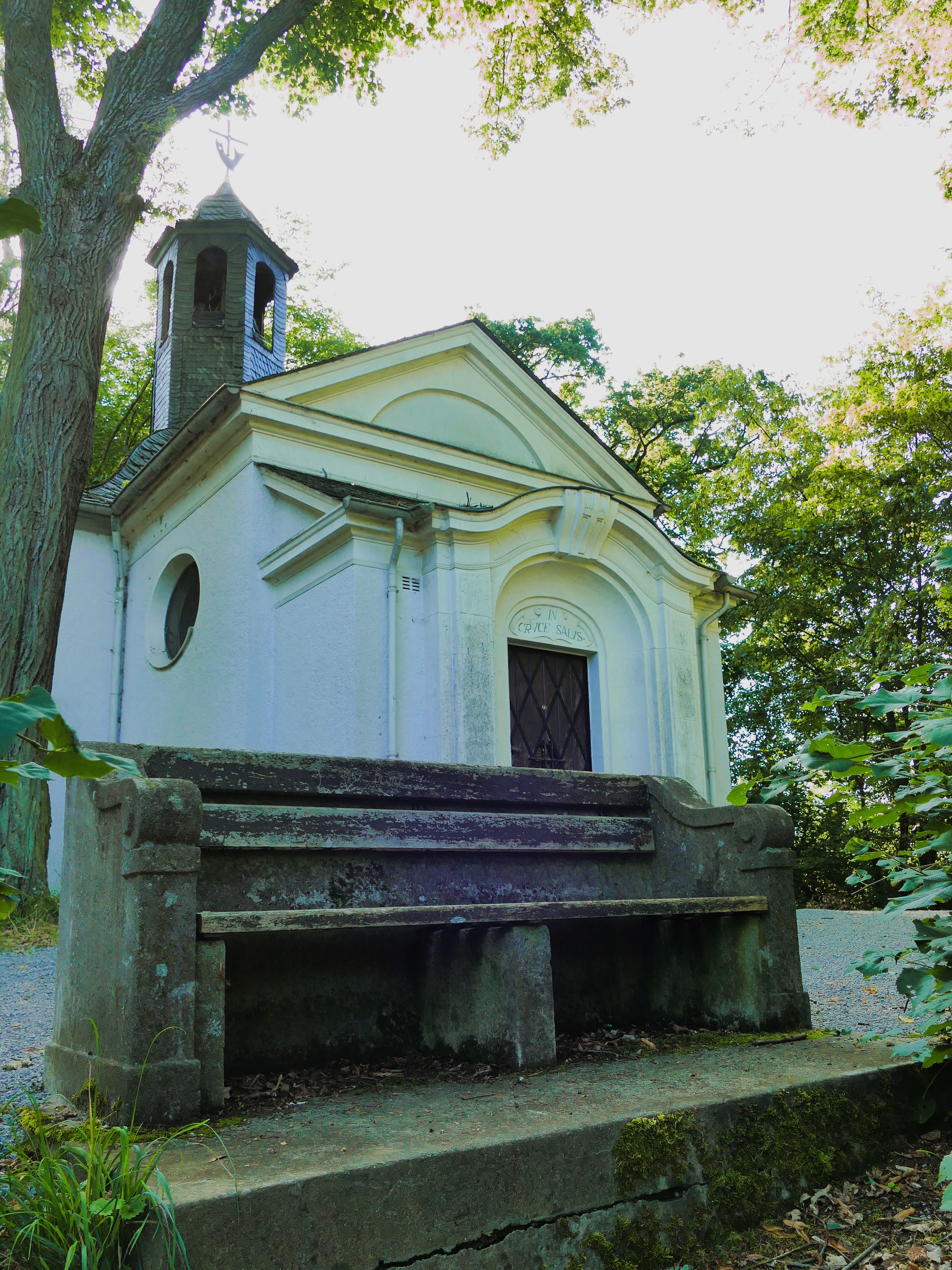 Die Kreuzkapelle markiert das Ende des Kreuzweges. Sie wurde vermutlich um 1666 von einer Familie Rath gestiftet. Ihr heutiges Aussehen hat sie seit der letzten Renovierung 1982. Die Inschrift über dem Eingang „In cruce salus“ bedeutet „Im Kreuz ist heil“. Vor der Kapelle steht eine gemütliche Ruhebank. Vielleicht magst du hier deine erste Rast einlegen.