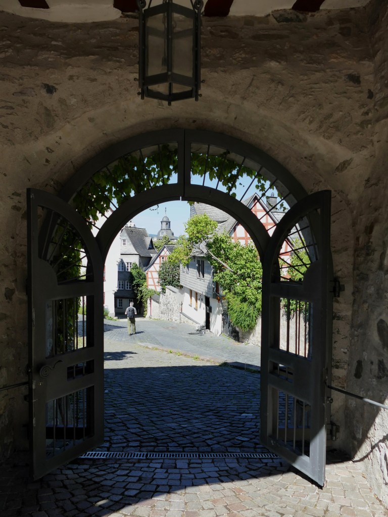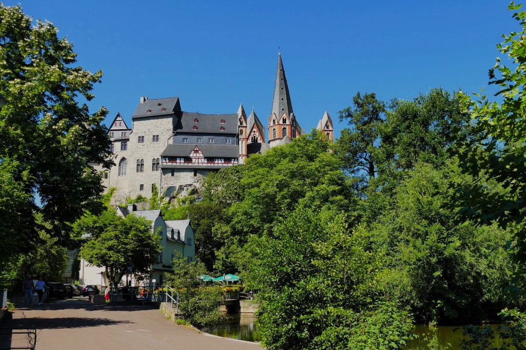 Danach geht es am imposanten Schloss Limburg vorbei (man kann derzeit nur den Hof besichtigen) wieder bergab zum Lahnufer. Am Lahnufer angekommen kannst du nach rechts abbiegen Richtung Schiffsanleger. Wirf mal hier einen Blick auf den Lahnlauf und schau‘, wohin dich das Schiff bringen kann: Lahnlauf bei Limburg.