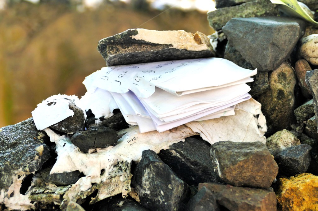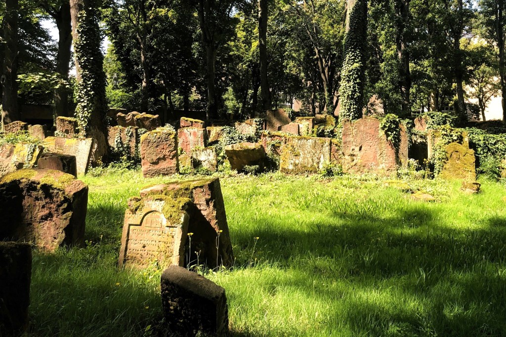 Viel Grün empfängt mich – und eine große Anzahl an Grabsteinen aus Sandstein. Manche sind an der Friedhofsmauer angebracht, andere stehen oder liegen auf dem großen Gelände. Es gibt auch einen Platz für die zerschlagenen Steine. Feinsäuberlich wurden die Fragmente der zerstörten Grabsteine zusammengetragen.