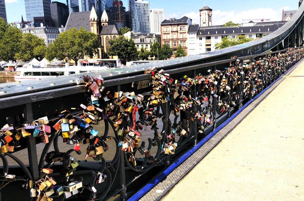 Der Eiserne Steg steht auch heute noch für Verbundenheit. Seit Goethes 200. Geburtstag 1999 schmückt ein Schriftzug aus Homers Odyssee die Brücke. Er lautet „Auf weinfarbenem Meer segelnd zu anderssprachigen Menschen“. Unzählige bunte Schlösser am Geländer besiegeln viele „Ewige Lieben“.
