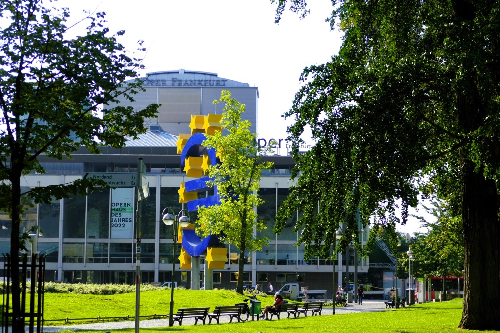 Ein paar Minuten später erreiche ich die Skulptur von Bulle und Bär vor der Neuen Börse aus dem Jahr 1879. Schon 1150 wird in Frankfurt die erste Herbstmesse erwähnt – und seitdem findet in Frankfurt ein reger Handel statt. Kurse schwanken. Bulle und Bär stehen symbolisch vor dem Börsengebäude und stellen die Marktteilnehmer dar. Während der Bulle optimistisch ist und auf Aufschwung hofft, ist der Bär der Pessimist und setzt auf fallende Kurse. Der Bulle stößt mit seinen Hörnern nach oben – er zeigt damit den Aufschwung. Der Bär schlägt mit seiner Pranke von oben nach unten und demonstriert den Kursabfall.